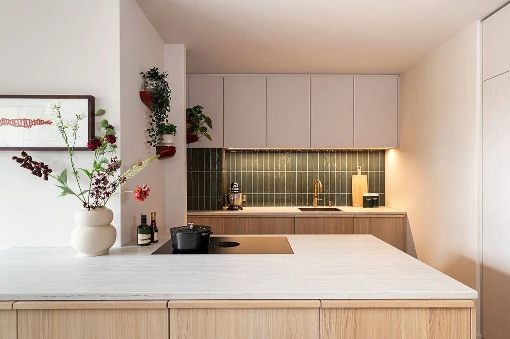 De wens was helder: een warme, rustige basis met genoeg karakter zodat het voelt als thuis. Er mochten elementen van de Scandinavische, retro en Japandi stijl terugkomen in het ontwerp. Een aantal persoonlijke elementen kregen een mooie plek, zoals het drankkastje (een erfstuk) en kunst achter de eettafel. Wij zorgden dat hun smaak samenkwam in een samenhangend plan, zodat alles klopt.